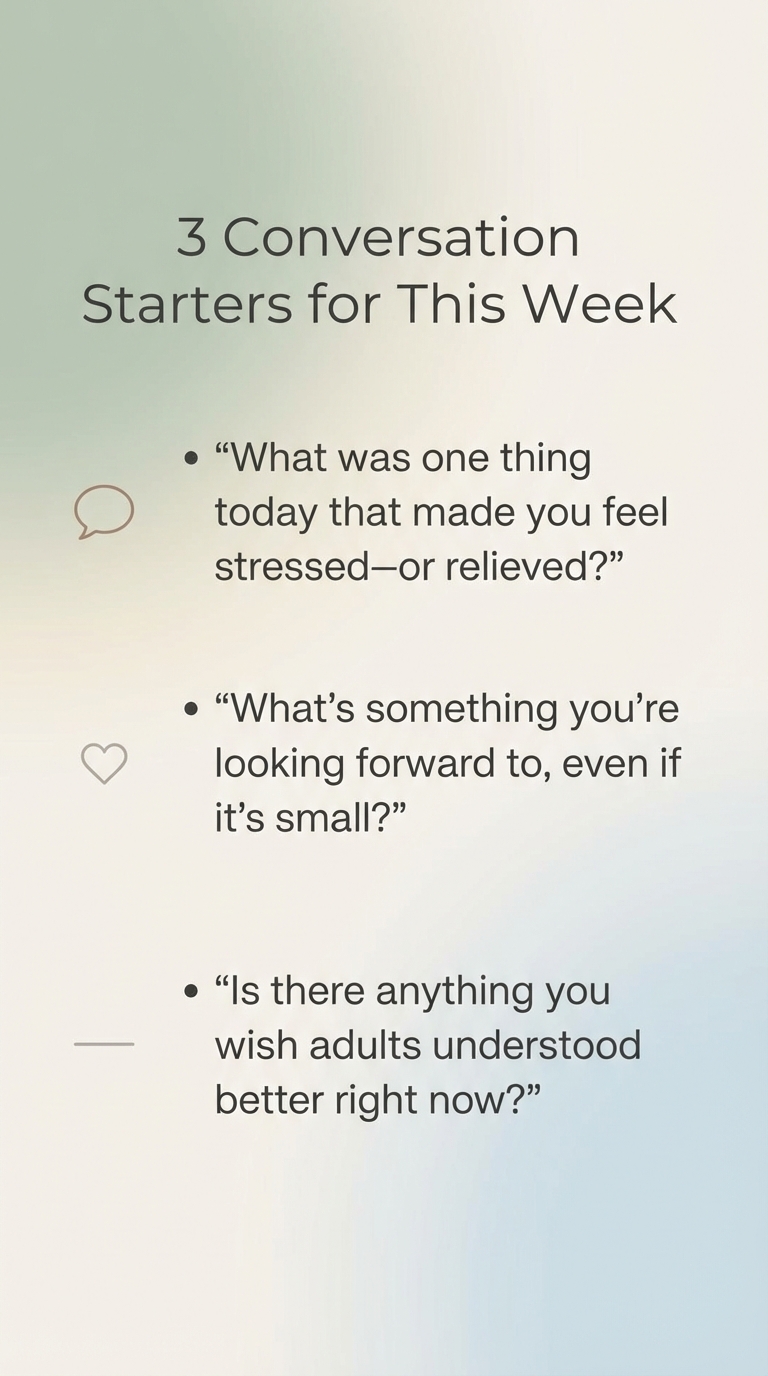 Open communication doesn’t start with a lecture—it starts with small, low-pressure moments of connection. If you’re not sure how to begin, try one of these gentle conversation starters this week: